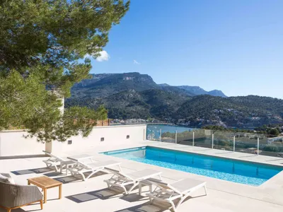 Luxury villa with beautiful views of the Port of Soller & the surrounding mountains. 40 minutes from the airport.Weekly rate: Low season Euro 5600 mid 6825 peak 8500