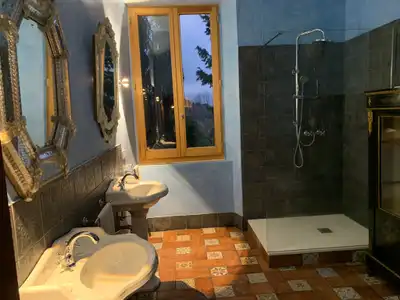 st floor: living room with frescoed ceilings, shower bathroom, bedroom with frescoed ceilings, vast terrace