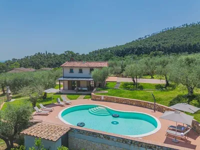 Villa Verde ToscaneVilla Verde Toscane is a charming farmhouse that underwent a complete renovation in 2022. Nestled amidst the picturesque hills of Pisa, it is surrounded by a captivating landscape adorned with hundreds of olive trees. The property enjoys a privileged location in proximity to the quaint and historic village of Vicopisano, known for its impressive walls and tower designed by the renowned architect Brunelleschi. Immersed in the serene countryside, Villa Verde Toscane offers a lovely retreat where guests can unwind in the enchanting garden or find solace under the inviting pergola. The idyllic setting provides breathtaking views of the sunsets over the rolling hills and the picturesque Tuscan valley, showcasing the region's quintessential beauty. Inside, the house boasts newly appointed interiors that tastefully blend contemporary comforts with traditional elements, such as the charming wooden beams and rafters adorning the ceilings. The attention to preserving the local architectural style is evident throughout the property. Adding to the allure, Villa Verde Toscane features a bean-shaped swimming pool, perfect for refreshing dips during the hot summer months. It serves as an inviting oasis, inviting guests to indulge and relax. Villa Verde Toscane is the ultimate destination for an unforgettable holiday in Tuscany, one of the most captivating regions in Italy. Its convenient location offers easy access to the nearby coastal areas, as well as to renowned cities like Pisa, Lucca, Florence, Volterra, San Gimignano, Siena, Carrara (famous for its marble white cave), and the renowned Cinque Terre, known for its scenic coastal beauty. Villa Verde Toscane distances only few steps from Villa Pontedera so, eventually, it is possible to rent them together and reach 10/12 sleeps.
