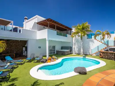 The pool area features artificial grass, eight sun loungers, and a large 8-seater jacuzzi—perfect for soaking up the Lanzarote sun. There is also a separate toilet and shower room for convenience.
