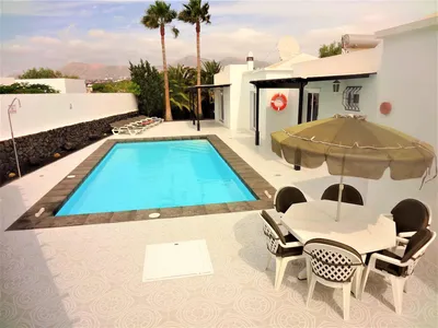 Detached luxury three bedroom villa with biological (no chemicals used) heated swimming pool, set in a 1/4 acre garden. Located within the prestigious residential area of Los Mojones, Puerto del Carmen, which is only a ten minute walk to the old town, harbour, new shopping centre and the attractive sandy beach of Puerto del Carmen.The accommodation comprises of one king size bedroom and two twin bedrooms, luxury family bathroom and large separate shower room. The kitchen is superbly fitted and includes dishwasher, washing machine, fridge/freezer, built-in oven and ceramic hob with extractor, microwave, toaster, coffee maker and kettle. The spacious lounge and dining room area are well furnished with internet TV streaming including Sky Movies and Sky sports channels, BBC, ITV,C4 and C5 channels and many more, DVD player. Unlimited Wi-Fi. There is a good selection of books and DVDs.