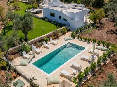 La Casa Puglia A dramatic residence in the heart of the beautiful countryside of Puglia Southern Italy. This Large authentic and modernised property is set in an quiet 4 hectare olive grove In the heart of Puglia. Enjoy this entire villa with all the modern comforts! , 10 minutes from Ostuni, {the white city} and 5 minutes from Ceglie Messapica, a town renowned for its authenticity and typically Puglian charm. Close to the beaches of the Adriatic Sea and the Ionian Sea. La Casa is made up of 2 buildings: Trulli offering 4 independent air-conditioned double bedrooms each with their own bathroom. Lamia including the fully air-conditioned living room, dining room and large kitchen fully equipped with an adjoining shaded covered terrace with outside dining and and kitchen. A short distance from the Trulli is a large private swimming pool measuring Xm by Ym (please specify dimensions) surrounded by a large area for sunbathing and an outdoor shower. After passing through the electric gate, you access the Trulli and the Lamia via the main driveway. At the end of this driveway is parking space (which has an electric car charging station).Bedroom Details