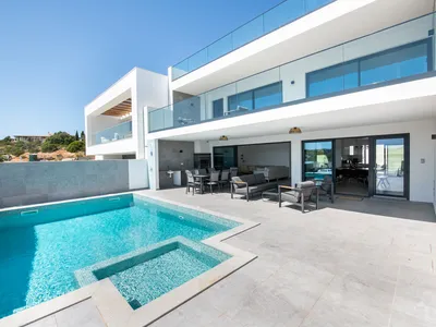 This exquisite modern home is special – boasting an open-plan lounge and dining area, kitchen, heated swimming pool, Jacuzzi, games room and stunning roof terrace. The villa offers 4 en-suite bedrooms.