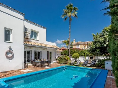 BEACHSIDE VILLA IN THE SUNOur villa is located at San Pedro Playa just a short walk (200m) from the blue flagged beach in a very quiet location with adequate car parking and privacy. Shops, bars, and restaurants are just a short walk and fashionable Puerto Banus is about 35 minutes' walk on the new beachside promenade or five minutes by car. The villa is furnished to a high standard and has marble floors throughout. There are five double bedrooms, Two bedrooms have double beds, two have twin beds and the fifth bedroom has bunks. Three bedrooms are ensuite and the other two bedrooms share a bathroom. There is also an upstairs balcony and solarium.