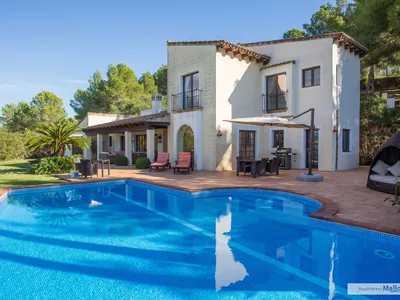Nestled in a tranquil residential neighbourhood near the Tennis Academy, Villa Mara is a spacious five-bedroom villa offering a private and peaceful retreat. Enjoy easy access to the exclusive beaches and amenities of Port Adriano and Santa Ponsa, just a short drive away. Enter the villa through secure electric gates and a private driveway leading to a secluded 1.5-acre plotThe ground floor features a spacious open-plan living and dining area with access to the outdoor terrace. Comfortable sofas surround the inviting fireplace, and exposed beams add to the villa's rustic charm. Large doors leading to the pool area allow for plenty of natural light. For a more intimate setting, there is also a separate smaller living room/snug with a TV. The well-equipped kitchen is stocked with everything you need for a self-catering holiday, with ample storage and a separate utility room for convenience.