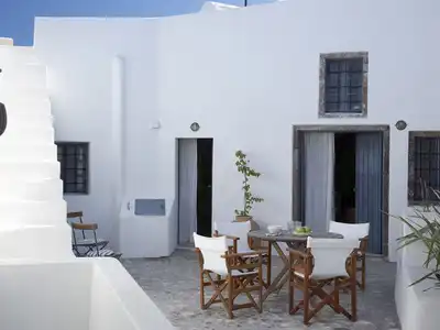 Situated in the 'trendy' medieval hilltop village of Pyrgos - benefiting from direct sunset views - Spiti Stelios originally served as an old artisan house and winery dating back to the early 18th century. This traditional building with truly beautiful caldera and island views, has been restored and converted into a simple and friendly family holiday home. Teams of local artisans have used traditional crafts, techniques and materials to restore this comfortable Santorini 4 bedroom dwelling.Approached via a footpath which has unique breathtaking views across the island and Aegean beyond, the entrance to Spiti Stelios leads into a large authentic cobble-stoned courtyard with outdoor dining area and barbecue. Spiti Stelios has a large 80 sq. mtr. sunbathing terrace with direct views of the island, ideal for relaxing with a glass of local wine and enjoying the spectacular sunsets which are [almost] guaranteed on the island. On a clear day it is possible to make out more than 10 different islands in the distance including Ios, Sikinos, Folegandros, Milos, Amorgos, Naxos, Irakleia, Christiana, etc.