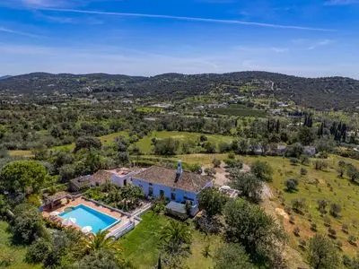 This glorious Portuguese blue painted villa, framed with vines and hibiscus, sits majestically in a prominent position on its own 200-acre private, gated Estate with breath taking views across the olive groves towards the coast in this gloriously unspoiled area of the Eastern Algarve. The house has been lovingly restored - retaining its original shutters, oak doors and terracotta floors, whilst offering the guests good wifi, smart T.V’S and all “mod cons”. The wine-making owner has filled the Manoir with carefully chosen art and sculptures all of which blend harmoniously with the other.
