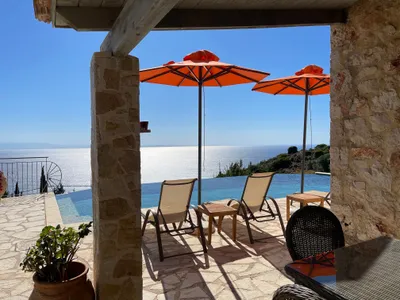 You pay no booking fees when received using this website and receive free payment protection.Villa Antonio is set high in the hills above the town of Skala, offering extraordinary panoramic sea and mountain views, as well as a lovely mix of contemporary and exquisite stone-accented rustic charm. Outside, the large private infinity pool overlooks the ocean making it the perfect place to relax and enjoy the amazing view. The patio includes a substantial shaded portion and a built-in stone BBQ with a large outdoor dining area to enjoy fabulous al fresco meals. Skala town with its outstanding restaurants, bars & village square is 7 mins away by car. Great sandy beaches within 5-10 mins. The villa is very private and not overlooked.