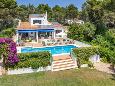 Villa Rosamond is located in Son Parc, a picturesque resort town on the northern coast of Menorca. Known for its crescent-shaped beach Arenal de Son Saura, with golden sand and turquoise water, the resort offers visitors a tranquil and idyllic setting for a relaxing holiday. Surrounding the beach, you'll find lush pine forests, creating a soothing natural backdrop. Son Parc is also home to the only golf course on the island, making it a haven for golfers. With its serene ambiance and natural beauty, this resort is a splendid destination for those seeking a relaxing getaway.The villa is built on a large plot offering a number of areas for relaxing in the sun or shade. With direct access from both the lounge and kitchen, is a covered porch with quality outdoor sofas, dining table with chairs and barbeque, the ideal spot for al fresco dining. A couple of steps from the porch lead down to the swimming pool terrace, furnished with a second table and chairs and sunbeds. Beyond the pool is a lawn garden with autochthonous flowers and plants, a peaceful area to relax in the shade.