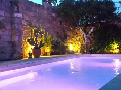"IL GIARDINO DEGLI ARANCI" has 280 square meters of indoor area and 800 square meters of outdoor area. Private pool, 8 meters for 4.30, protected by a gate, for little children, "secret" gardens with citrus, fruit trees, bougainvillea. The villa consists of a main body and an annex dependance on the ground floor with gardens and a large terrace of 170 sqm on the first floor with a double bedroom with bathroom en suite. All bedrooms overlook the "secret" garden, inside the house (typical of the Salento farms), a cozy and private place for relax, complete with table with armchairs. Here, another independent exit leads to a private court that emerges on a small square with a comfortable coffee shop. The photographed bedrooms (picture with captions):'Orange Blossom', 'Citronella', 'Mint on terrace', 'Lavender', Suite Bouganville. All with bathrooms en suite, except Citronella which has private bathroom in front of.