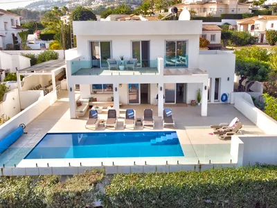 Welcome to La Vista, your modern luxury retreat in Moraira, Spain. This stunning 6-bedroom, 6-bathroom villa offers a blend of comfort and elegance, perfect for family vacations. Situated moments from the vibrant beaches, restaurants, and bars of Moraira and only a 5-minute drive to the main beach, La Vista promises an unforgettable stay. Enjoy modern amenities such as air conditioning, hi speed fibre Wi - Fi, and a fully equipped kitchen. Relax and unwind at La Vista , where every detail is dedicated to your comfort and enjoyment.You enter the villa into the open plan lounge and kitchen / dining room with a view out to the huge pool terrace and 10m x 5m pool with roman steps and a shallow end for the kids. There are plenty of sunbeds for all guests and a comfortable "Ibiza Style" lounge seating area under the shade of the villa's upper terrace. To the rear of the pool terrace is another dining area for 12, with a modern gas BBQ, preparation area and sink for the budding chefs!