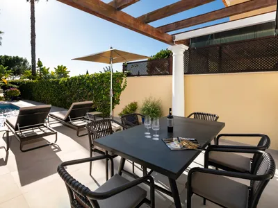 Through the French windows from the lounge / dining area, you will reach the pool terrace with a small lawned garden. Here you will find a seating space ideal to relax and enjoy an alfresco meals or cocktails and two different covered dining areas, one of which is below the covered gas BBQ terrace.