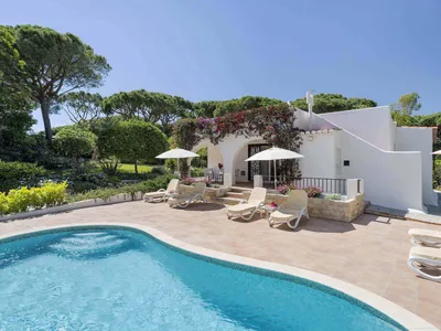 Casa dos Arcos. Perfectly located, about 7 minutes walk to beach and golf, charming detached villa, ideal for family holidays. The garden gate opens on to the 18th Fairway of the Royal Golf Course and it is a short walk to the Supermarket, Medical Centre, the famous Tennis Centre (weekly group coaching), the Golf Club with Royal Spa, and the Beach. There is a Children's Club near the Beach. Casa dos Arcos is built on one level and ideal for all ages, the furniture is traditional and comfortable. It is surrounded by a large garden offering sun and shade and plenty of room for children to play. There is a paved terrace with kidney-shaped private swimming pool, sun loungers with cushions, umbrellas and chairs. The covered verandah with dining table is perfect for sheltered meals at all times, and a secluded roof terrace offers a lovely spot for sunbathing or an evening drink as the sun goes down. We have a fine selection of buckets, spades, games, books and BBQ. This villa feels like a home rather than a letting property.Bedroom 1: Superking bed with fitted cupboards and safe, en suite bathroom with bath, over shower, bidet. WC and vanity basin unit, heated towel rail