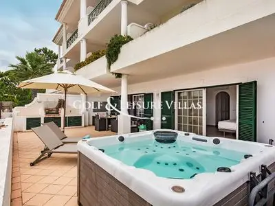 This 2 bedroom 2 bathroom apartment is located on the 5 star resort of Vale do Lobo. The apartment is located opposite the tennis centre where there are several tennis courts, padel courts, an outdoor pool (not heated), a gym, restaurant and bar. The facilities here are available at an additional cost. The pool is 10 euros per day per person for guests. Vale do Lobo has a famous beautiful beach and two splendid golf courses.The apartment has steps leading to the kitchen, living and dining area and 2 bedrooms both with ensuite bathrooms. The living area leads onto a large south facing terrace with jacuzzi. The jacuzzi heating is available at an additional cost of 200 euros per week. There are more stairs leading down to the garage and street access.