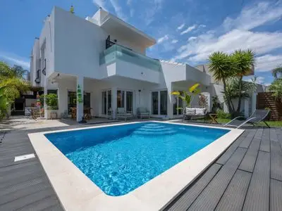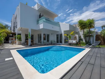 This refurbished 4 bedroom villa in a quiet Vilamoura street on a large plot near golf courses and amenities. It features a bright, open-plan layout connecting the lounge, dining area, and fully equipped kitchen, along with a separate laundry room. A guest toilet is conveniently located on the ground floor, just off the entrance hall or at the bottom of the stairs. Air conditioning throughout.Outdoors, you'll find a private pool, BBQ area, alfresco dining space, and a garden—ideal for relaxation and al-fresco dining.